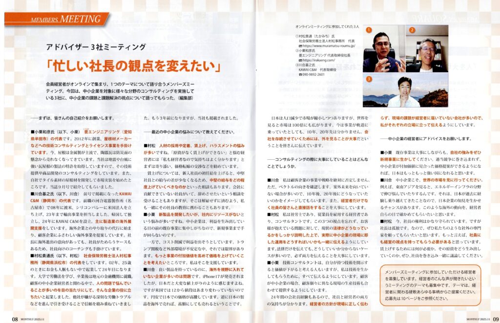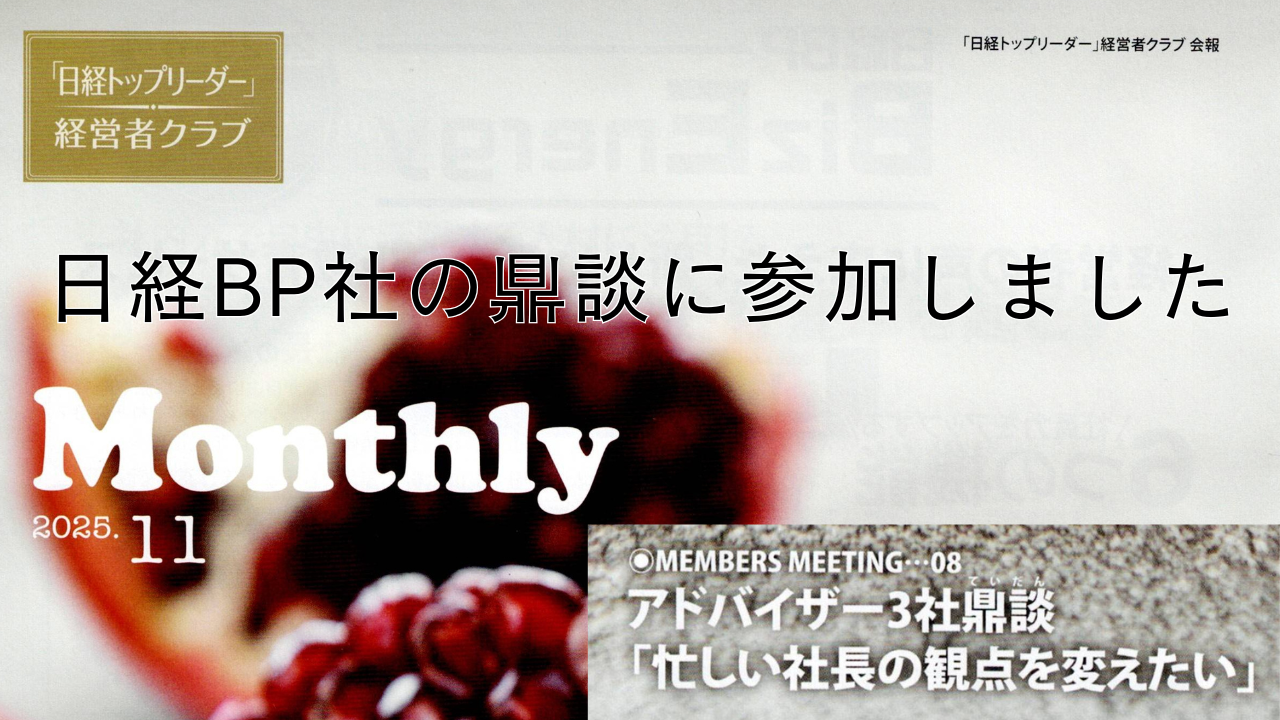 日経BP社の雑誌「日経トップリーダー」の経営者クラブ会報「Monthly」の9月号で取材を受けた際に弊社の技術コンサルティング事業についてお話ししたところ、「Monthly」の11月号にアドバイザー3社による鼎談に出て欲しいとのオファーを受けました。